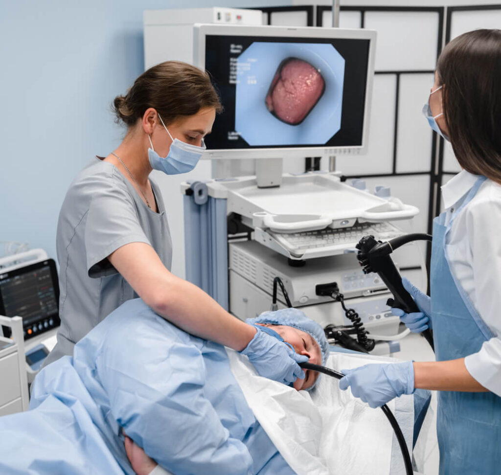 A thin, flexible tube with a camera (endoscope) is passed down the throat to examine the oesophagus and stomach.